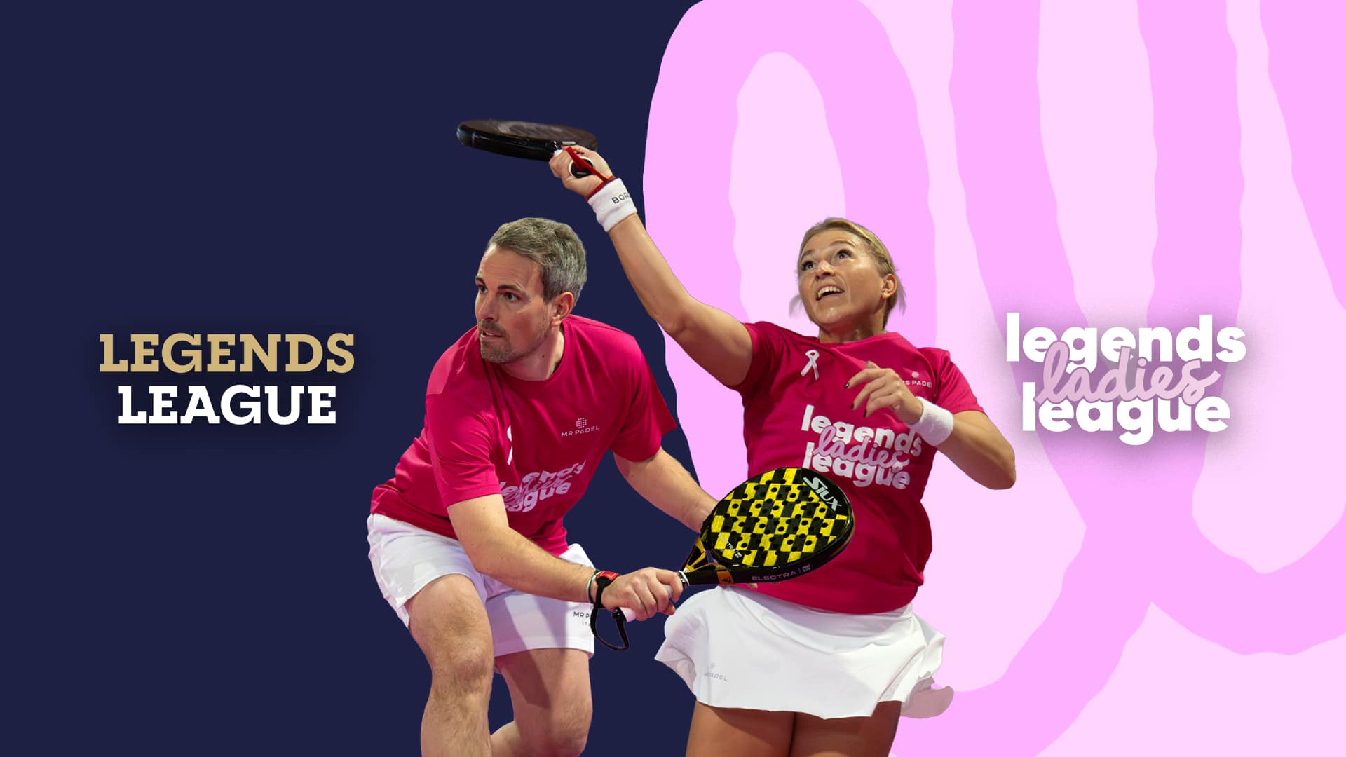 Twee padelspelers in roze shirts tijdens de Legends Ladies League slaan samen de bal op een indoorbaan, met het Legends League logo op de achtergrond.